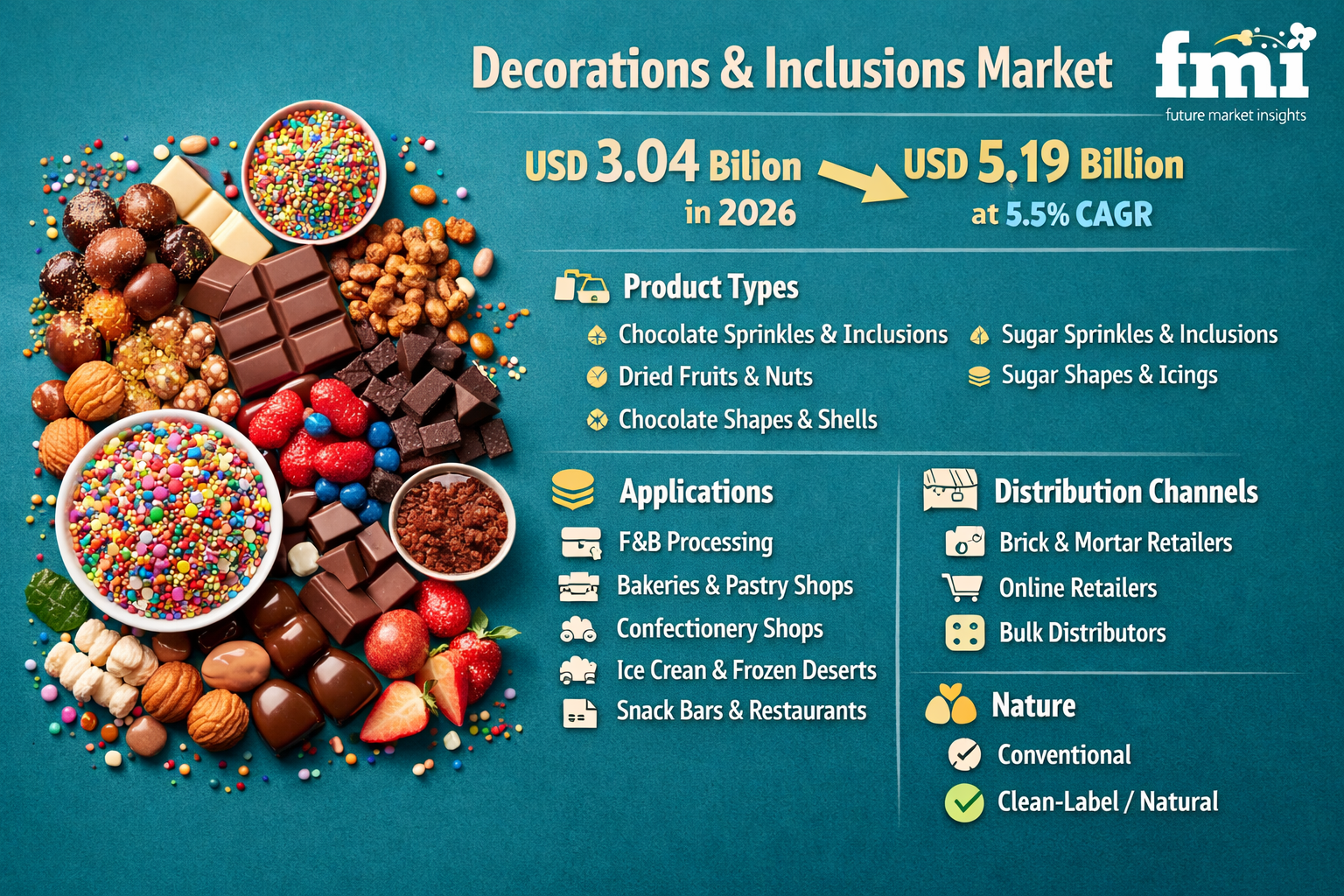 NEWARK, DE, UNITED STATES, March 30, 2026 /EINPresswire.com/ -- The European decorations and inclusions market is no longer just about aesthetics—it has become a strategic growth lever for food manufacturers. According to Future Market Insights (FMI), the market is projected to grow from USD 3.04 billion in 2026 to USD 5.19 billion by 2036, advancing at a steady 5.5% CAGR.