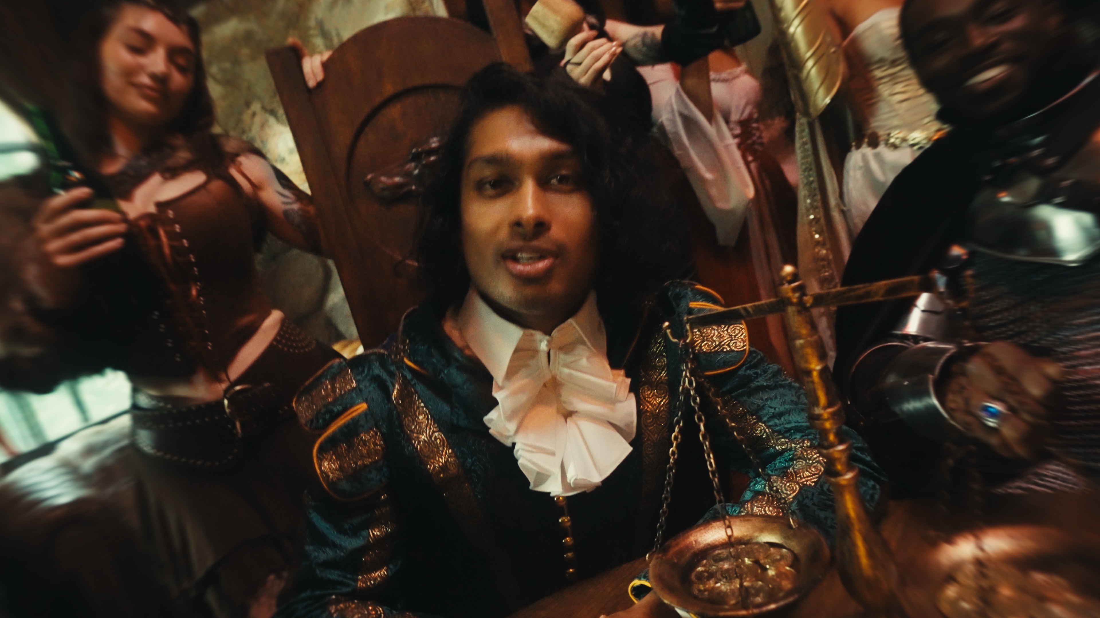 Ashwin Gane in character on the “DND (Do Not Disturb)” video set, seated at a tavern table in ornate teal and gold attire as the late‑night fantasy party unfolds around him.
